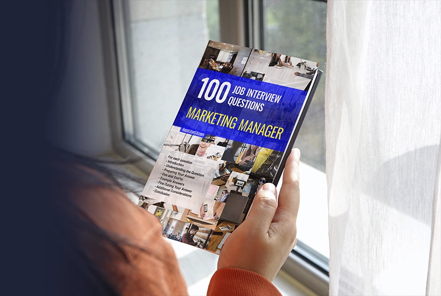 The image shows a girl by a window holding a book called “100 Job Interview Questions for Marketing Manager.” The cover is designed with a collage of professional office images and features bold text emphasizing the interview questions. The book is intended to help job seekers prepare for interviews in the marketing field, offering insights on answering common questions and improving interview performance.