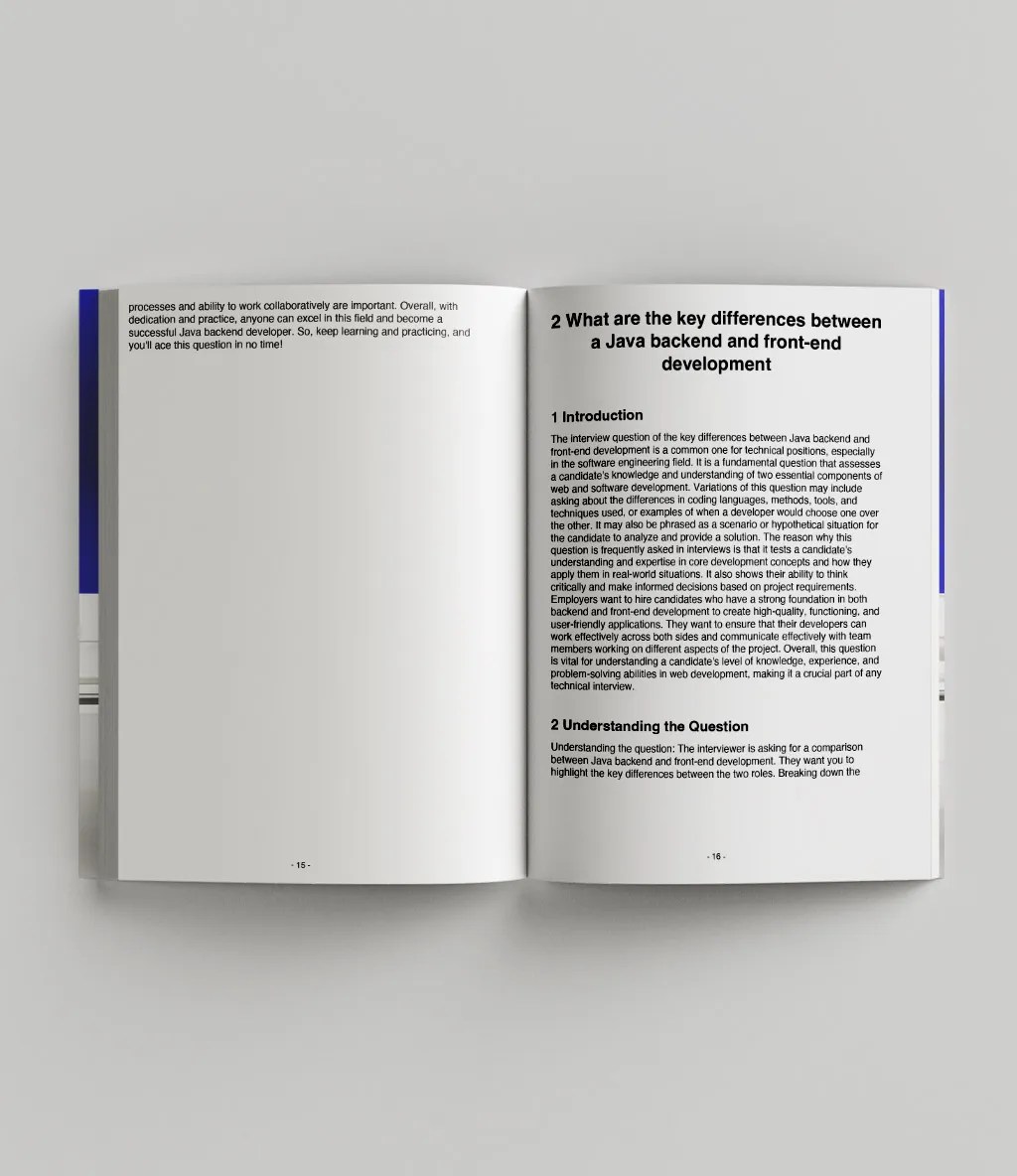 Improve Your Chances of Landing Your Dream Java Backend Developer Job with ‘100 Java Backend Developer Interview Questions’ – the Essential Guide for Aceing Your Next Interview. This SEO optimized PDF book features a comprehensive collection of 100 interview questions specifically tailored for Java backend developers. Prepare yourself with confidence and stand out from the competition with this invaluable resource at your fingertips.